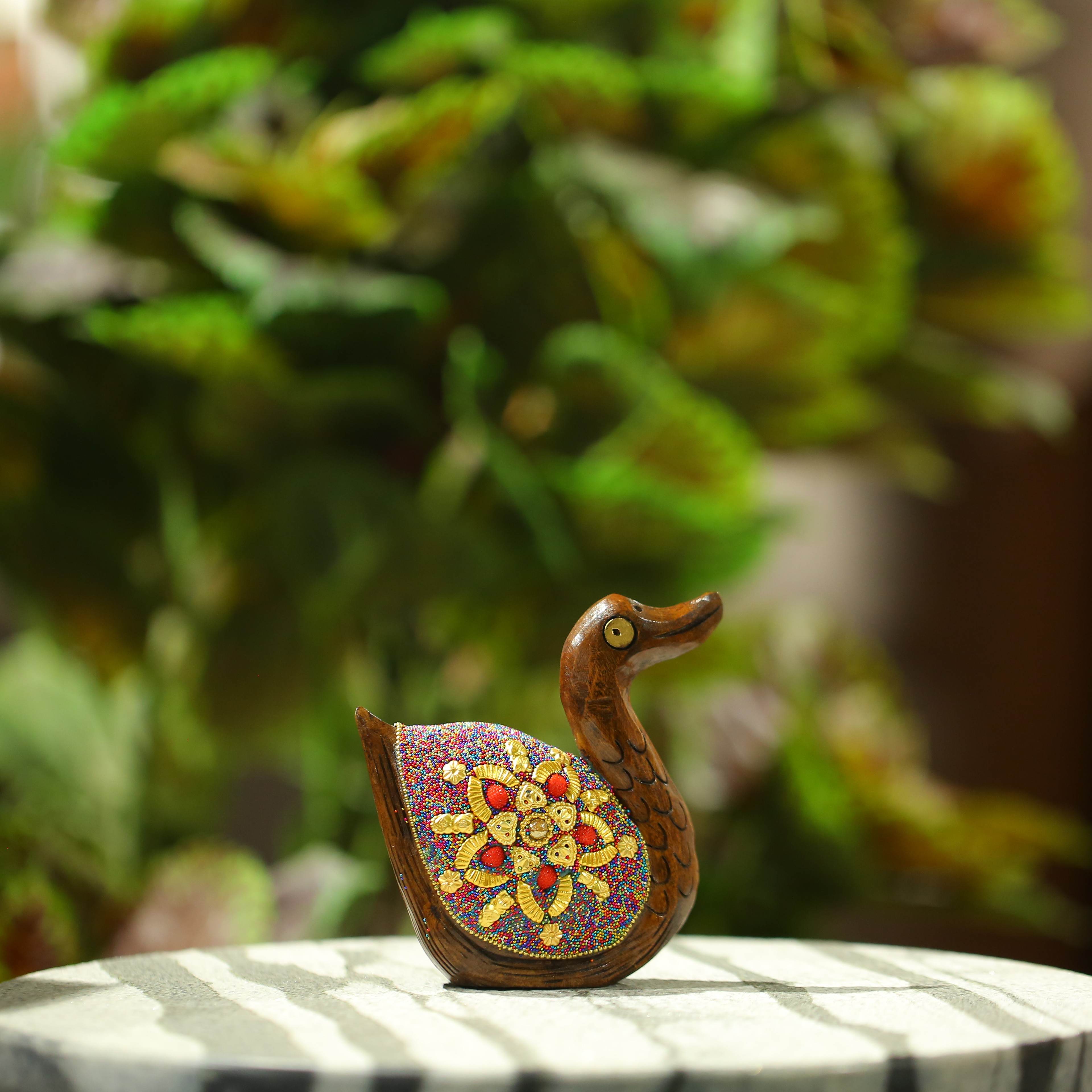 Wooden Duck W/Multi Color Beads W/Flower Work Oxod 4"